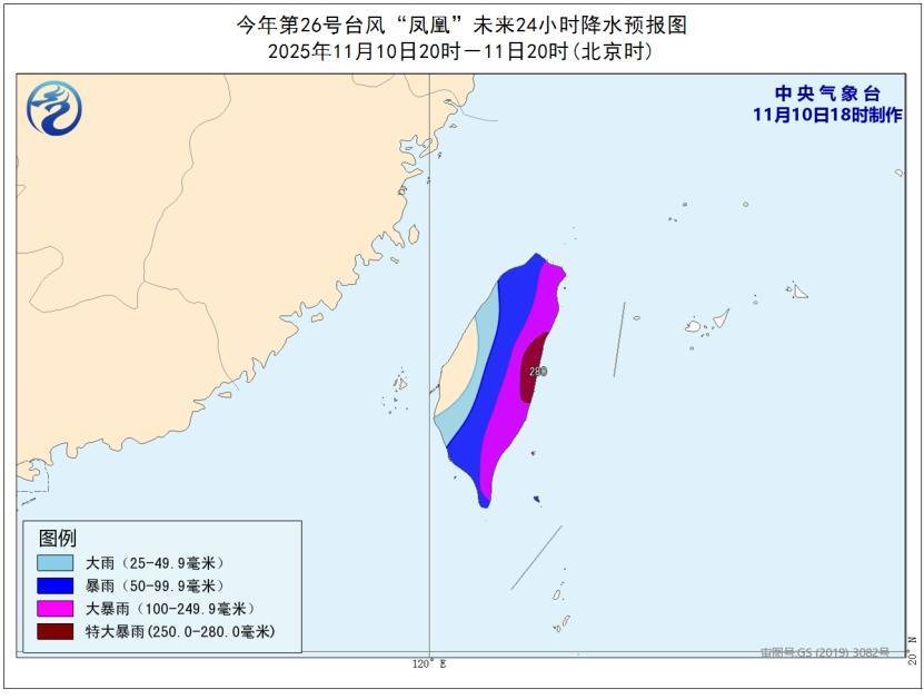 降水预报:10日20时到11日20时,台湾岛大部将有大到暴雨,其中东部部分地区有大暴雨到特大暴雨(250-280毫米)。
